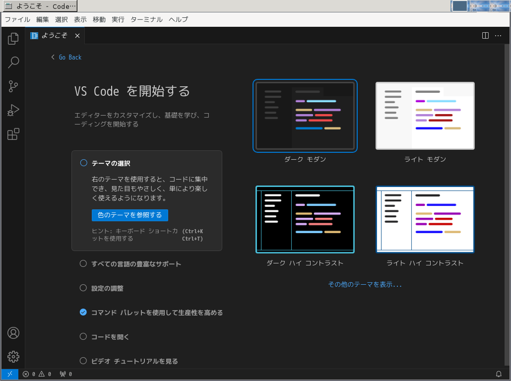 日本語化後、再起動直後の状態です。 2024年12月23日の時点で、下記のバージョンでした。 「Visual Studio Code」の操作等については「統合開発環境 Visual Studio Code」をご参照ください。 |