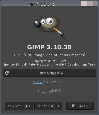 起動後の状態です。 2025年5月16日の時点で、下記のバージョンでした。 操作については、「画像編集ソフト GIMP2」に掲載しています。 上記は簡単なものですので、詳細なものがほしい方は、各所に初歩の手引きから応用編までありますので、そちらを参考にしてください。 |