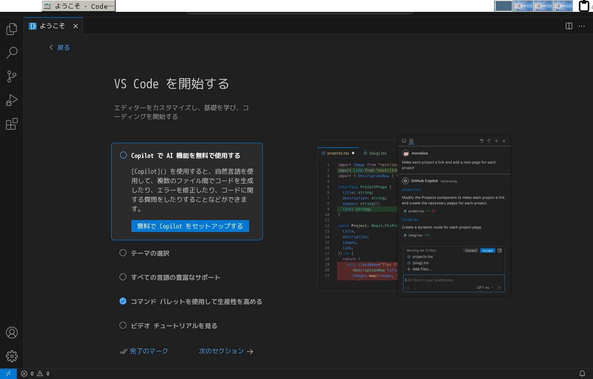 日本語化後、再起動直後の状態です。 2025年5月16日の時点で、下記のバージョンでした。 「Visual Studio Code」の操作等については「統合開発環境 Visual Studio Code」をご参照ください。 |