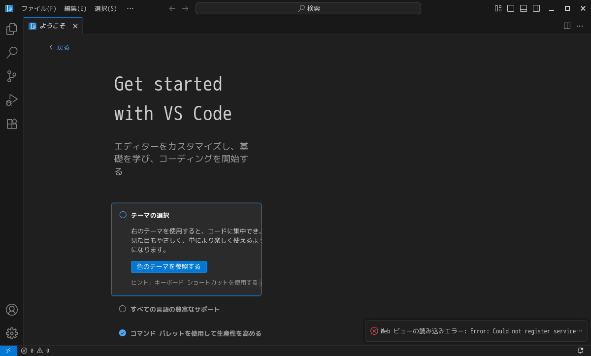 日本語化後、再起動直後の状態です。 2025年7月14日の時点で、下記のバージョンでした。 「Visual Studio Code」の操作等については「統合開発環境 Visual Studio Code」をご参照ください。 |