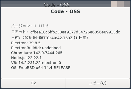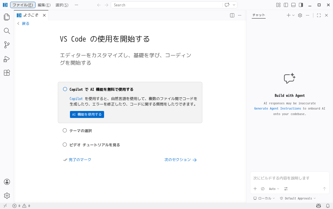 日本語化後、再起動直後の状態です。 今回の表示は、なかなか異色です。 2026年4月7日の時点で、下記のバージョンでした。 「Visual Studio Code」の操作等については「統合開発環境 Visual Studio Code」をご参照ください。 |