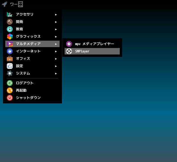 1. 概要 マルチメディアプレイヤーとして、「SMPlayer」を使用します。 2. インストール 「OctoPkg」で、「smplayer」を検索して、インストールします。 このバージョンの「pkg」は、「.mp4」再生時に「mpv」がこけるので、「ports」で、オプションを変えて再インストールする必要があります。 その手順については、「マルチメディアプレイヤー - SMPlayer」をご参照ください。 3. 起動 「スタート」→「マルチメディア」→「SMPlayer」
