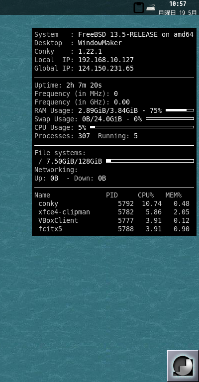 ログインしなおすと「Conky」が起動し、右端に下記のように表示されます。
