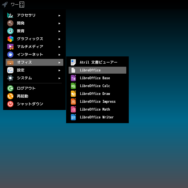 1. 概要 オフィススイートとして、「LibreOffice」を使用します。 2. インストール 「OctoPkg」で、「ja-libreoffice」を検索して、インストールします。 3. 起動 「スタート」→「オフィス」→「LibreOffice」