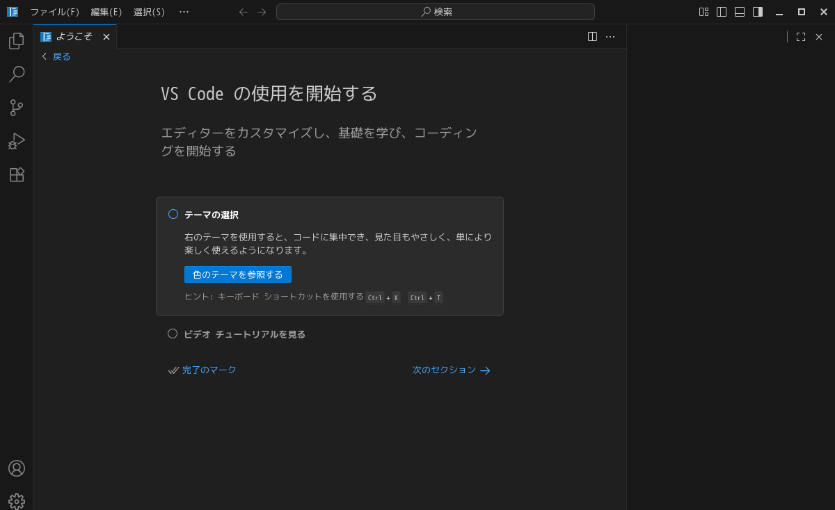 日本語化後、再起動直後の状態です。 2025年12月26日の時点で、下記のバージョンでした。 「Visual Studio Code」の操作等については「統合開発環境 Visual Studio Code」をご参照ください。 |