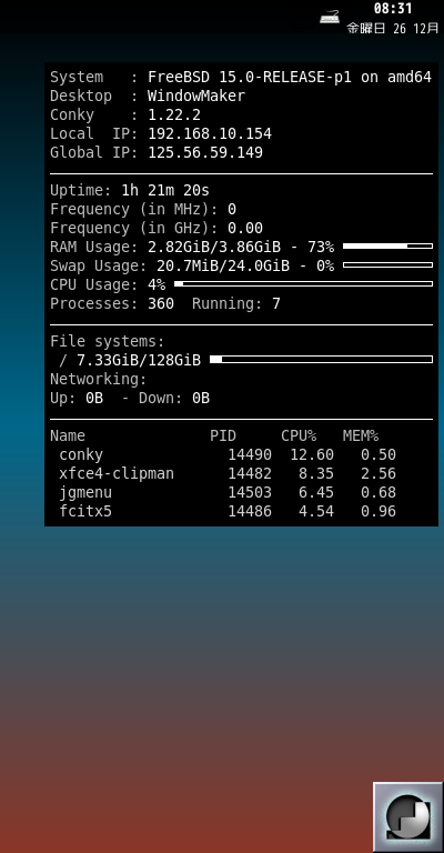 ログインしなおすと「Conky」が起動し、右端に下記のように表示されます。