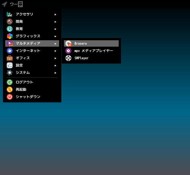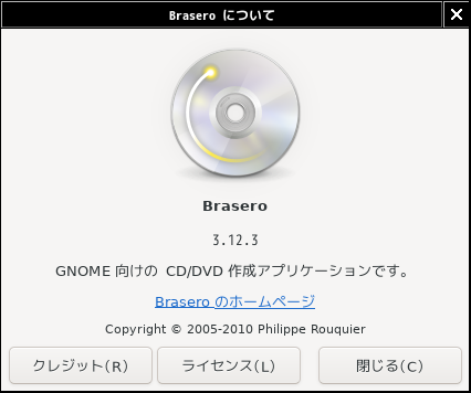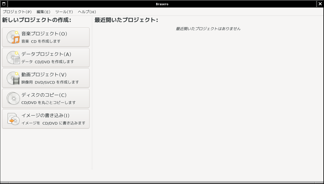 1. 概要 「Brasero」は、光学ディスク(CD・DVD)のライティングソフトです。 2. インストール 「OctoPkg」で、「brasero」を検索して、インストールします。 インストール直後は、起動できないことがあります。 そういうときは、一度、ログインしなおします。 3. 起動 「スタート」→「マルチメディア」→「Brasero」