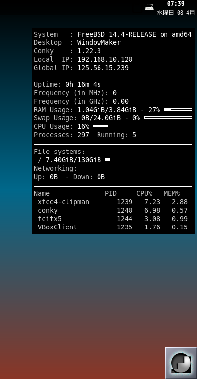 ログインしなおすと「Conky」が起動し、右端に下記のように表示されます。