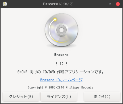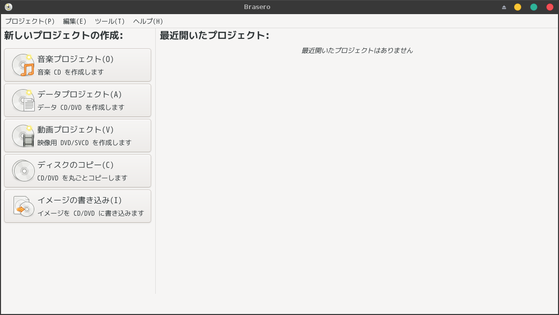起動直後の状態です。 2024年11月20日の時点で、下記のバージョンでした。 操作等については「FreeBSD - デスクトップ環境構築 - 共通事項 - 光学ディスクライティングソフト」をご参照ください。 |