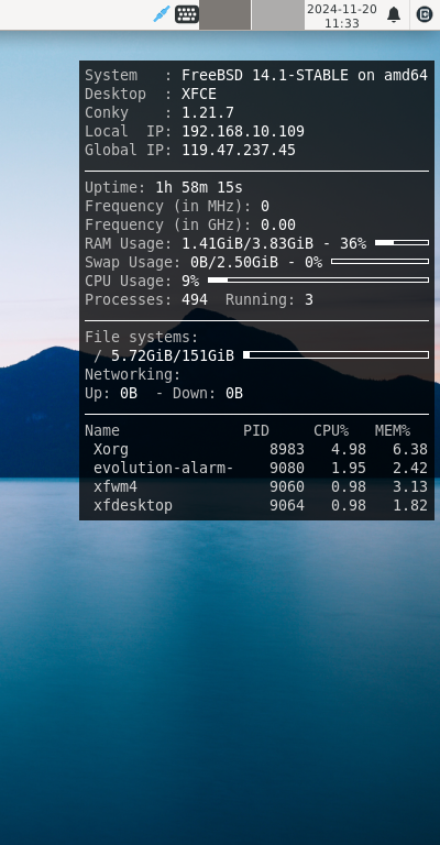「GhostBSD 24.10.1 XFCE」-「Conky 表示」