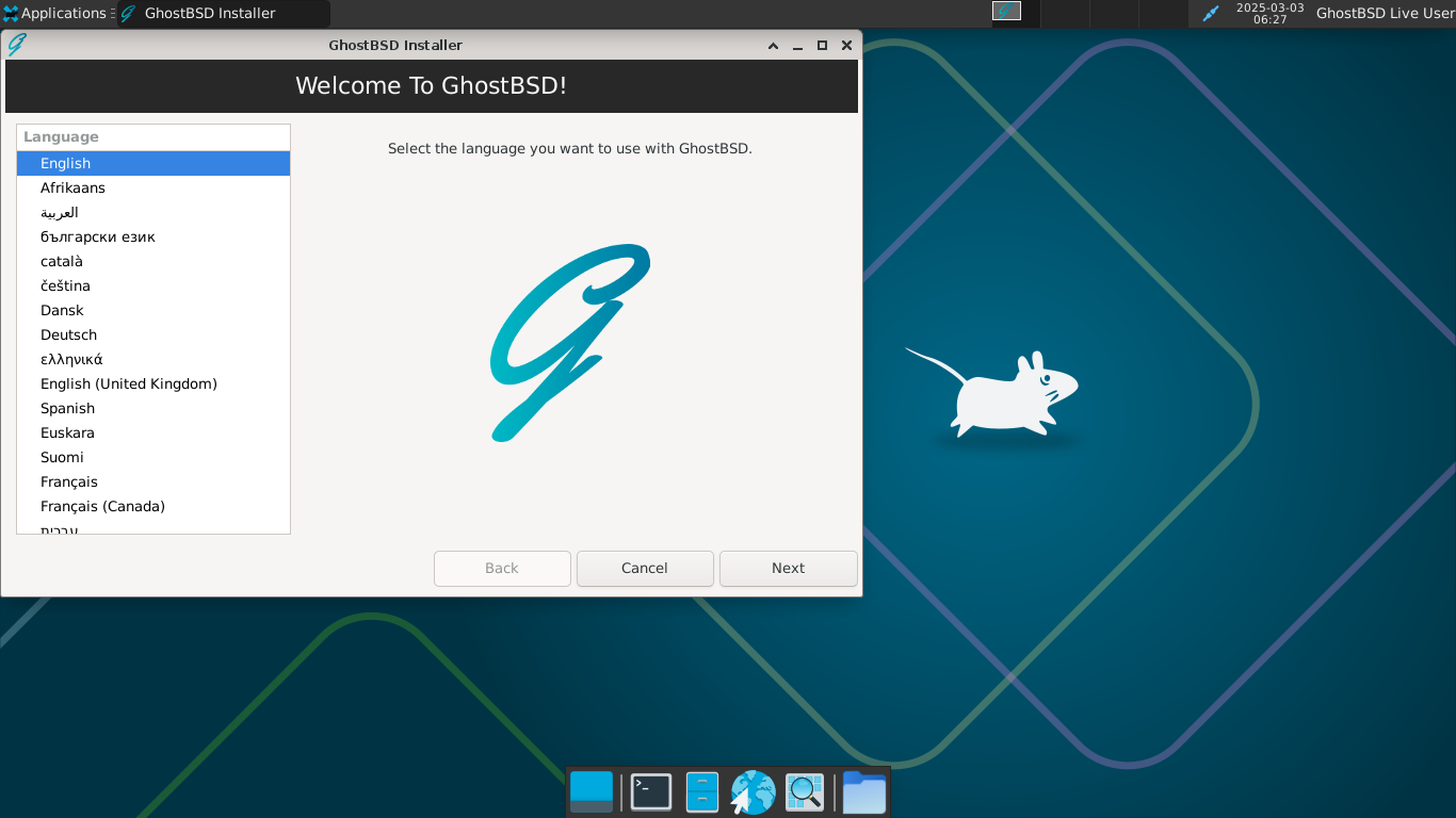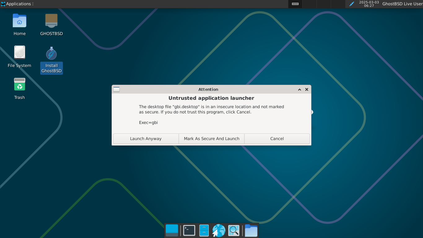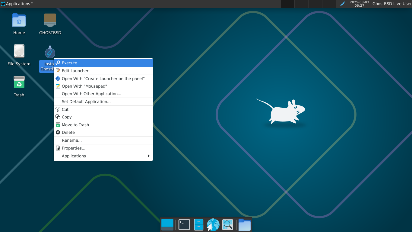 1. 概要 インストール手順の詳細は、「GhostBSD - 25.01 - 共通事項」に記載しておりますので、そちらをご参照ください。 2. インストール 参照ページと大きく違うのが、インストーラ起動時の画面です。 インストーラを右クリックして 「Execute」