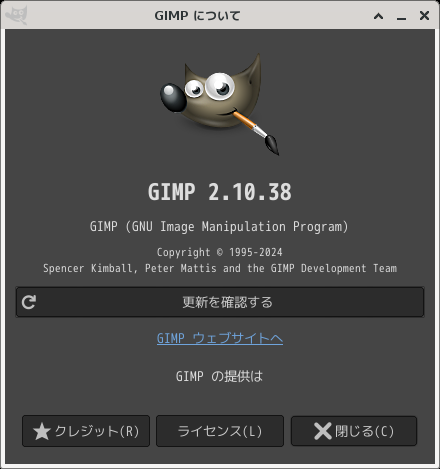 起動直後の状態です。 2025年3月4日の時点で、下記のバージョンでした。 「gimp」の操作については、「画像編集ソフト GIMP2」に掲載しています。 上記は簡単なものですので、詳細なものがほしい方は、各所に初歩の手引きから応用編までありますので、そちらを参考にしてください。 |