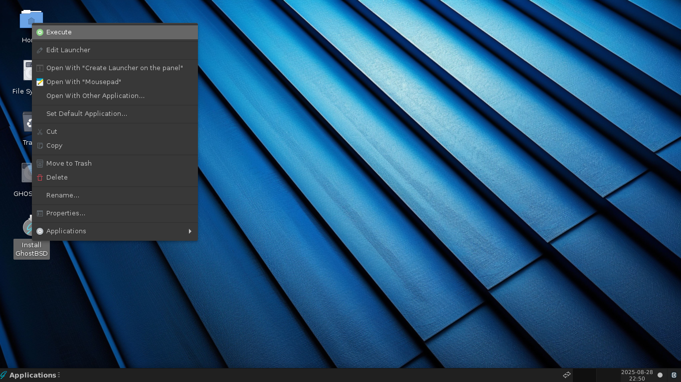 1. 概要 インストール手順の詳細は、「GhostBSD - 25.02 - 共通事項」に記載しておりますので、そちらをご参照ください。 2. インストール 参照ページと大きく違うのが、インストーラ起動時の画面です。 インストーラを右クリックして 「Execute」