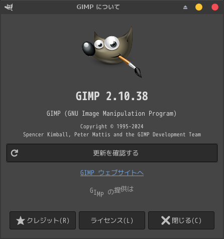起動直後の状態です。 2025年8月29日の時点で、下記のバージョンでした。 「gimp」の操作については、「画像編集ソフト GIMP2」に掲載しています。 上記は簡単なものですので、詳細なものがほしい方は、各所に初歩の手引きから応用編までありますので、そちらを参考にしてください。 |