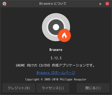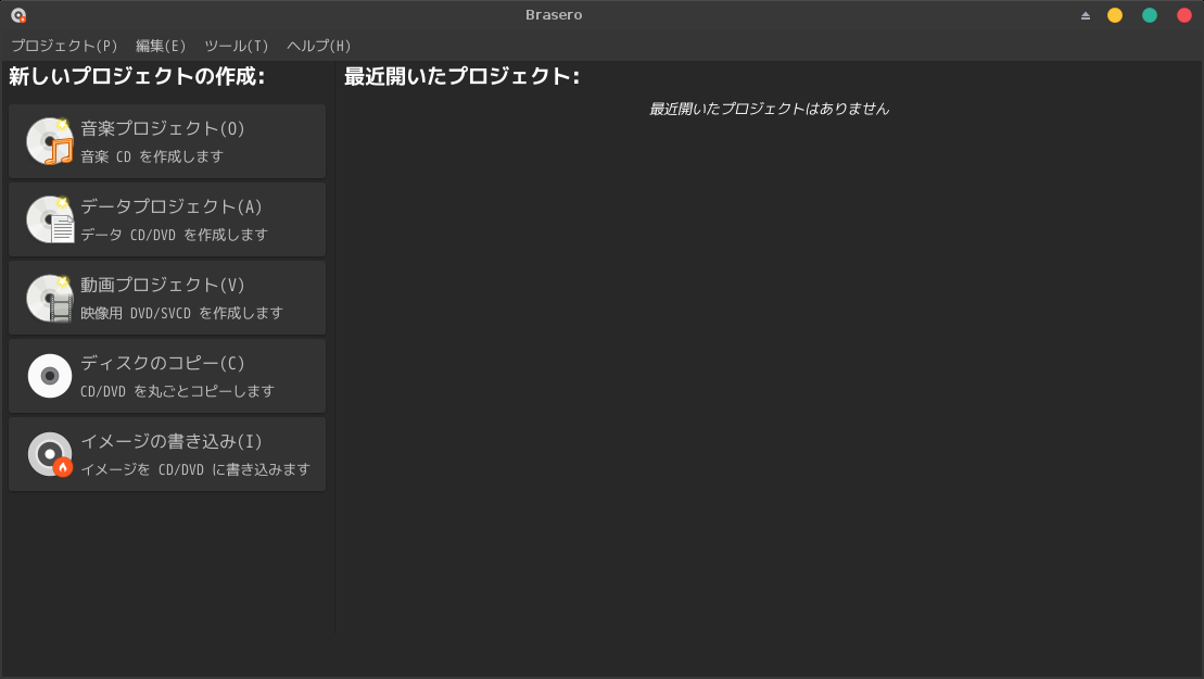 起動直後の状態です。 2025年9月1日の時点で、下記のバージョンでした。 操作等については「FreeBSD - デスクトップ環境構築 - 共通事項 - 光学ディスクライティングソフト」をご参照ください。 |