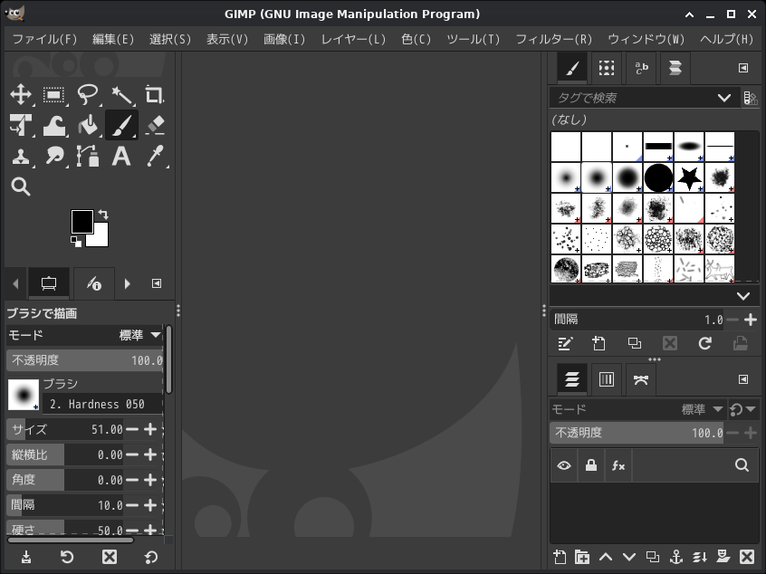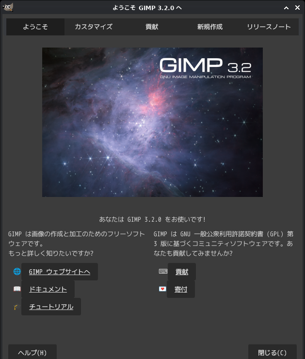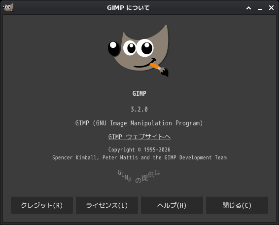「閉じる」 起動直後の状態です。 2026年4月21日の時点で、下記のバージョンでした。 「gimp」の操作については、「画像編集ソフト - GIMP」に掲載しています。 上記は簡単なものですので、詳細なものがほしい方は、各所に初歩の手引きから応用編までありますので、そちらを参考にしてください。 |