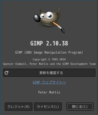 起動直後の状態です。 2024年10月1日の時点で、下記のバージョンでした。 操作については、「画像編集ソフト GIMP2」に掲載しています。 上記は簡単なものですので、詳細なものがほしい方は、各所に初歩の手引きから応用編までありますので、そちらを参考にしてください。 |
