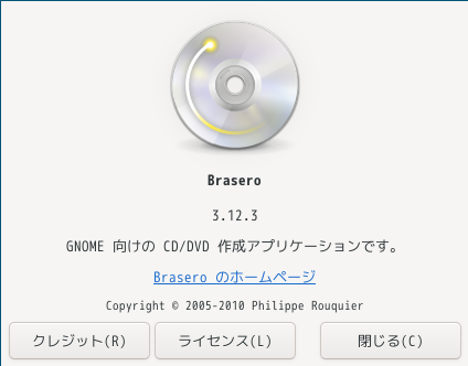 1. 概要 「Brasero」は、光学ディスク(CD・DVD)のライティングソフトです。 基本的な操作については「共通事項 - 光ディスクライティング」をご参照ください。 2. インストール 「OctoPkg」で、「brasero」を検索して、インストールします。 3. 起動 「スタート」→「サウンドとビデオ」→「Brasero」