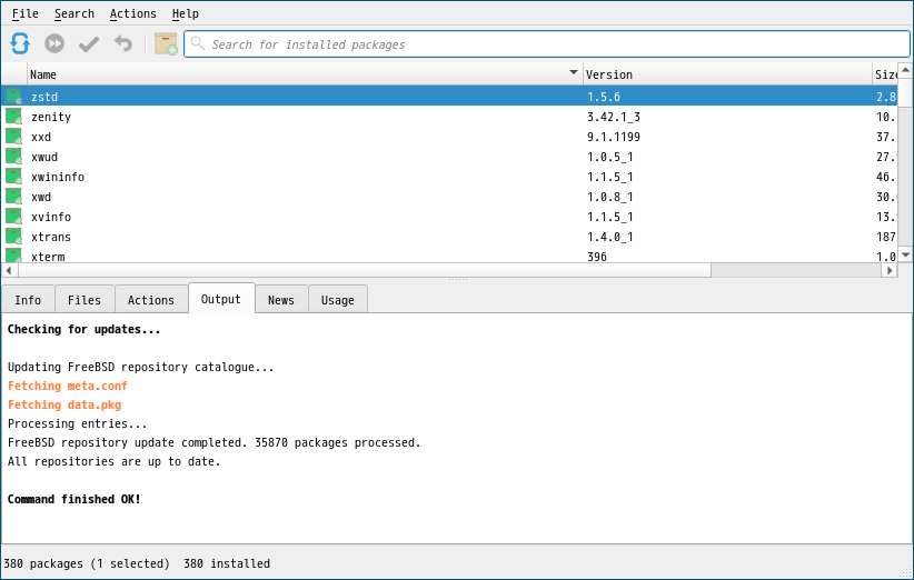 1. 概要 「OctoPkg」は、パッケージ管理(pkg)のグラフィカルフロントエンドです。 基本的な操作については共通事項の「パッケージ管理 OctoPkg」を参照してください。 2. インストール ここまでは、コマンドでインストールしなければならない。 「root」ユーザ権限で。 pkg install -y octopkg 3. 起動 「スタート」→「システム」→「OctoPkg」
