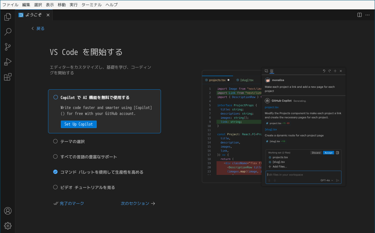 日本語化後、再起動直後の状態です。 2025年3月19日の時点で、下記のバージョンでした。 「Visual Studio Code」の操作等については「統合開発環境 Visual Studio Code」をご参照ください。 |