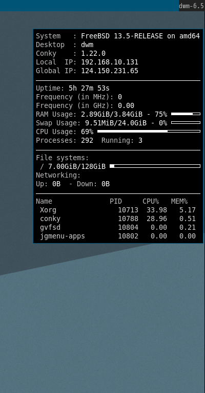 dwm - FreeBSD 13.5 RELEASE - タスクマネージャ Conky