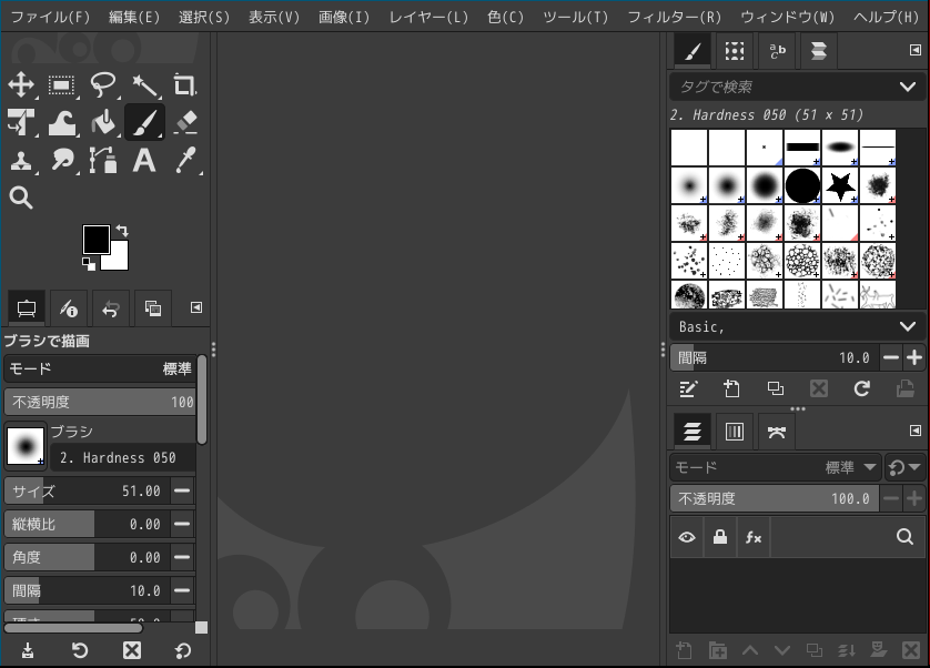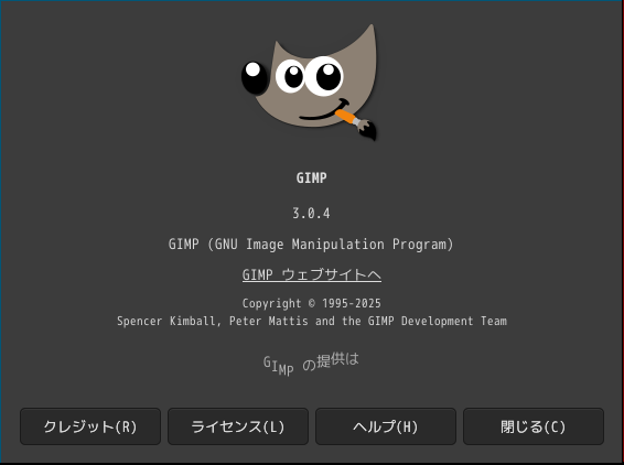 起動直後の状態です。 起動直後の状態です。 2025年12月9日の時点で、下記のバージョンでした。 操作については、「画像編集ソフト - GIMP」に掲載しています。 上記は簡単なものですので、詳細なものがほしい方は、各所に初歩の手引きから応用編までありますので、そちらを参考にしてください。 |