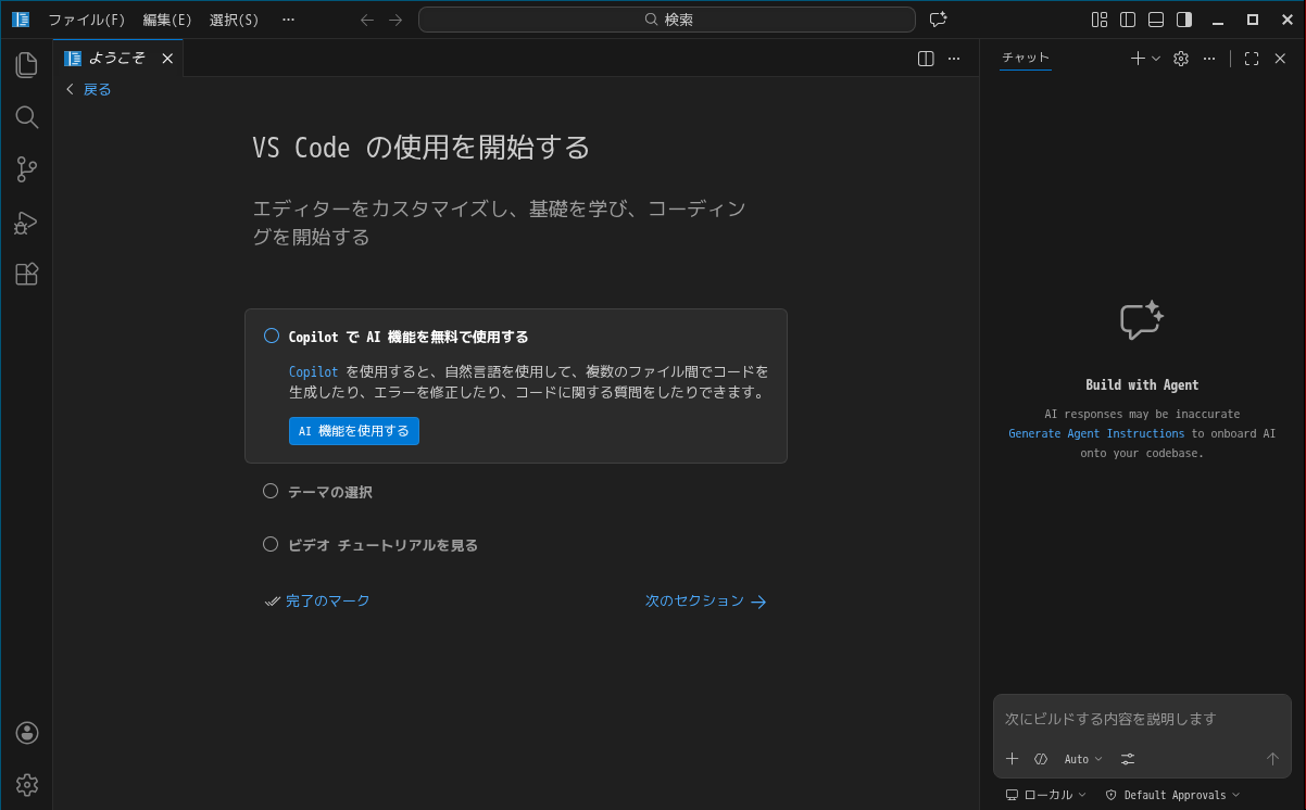起動直後の状態です。 2026年4月1日の時点で、下記のバージョンでした。 日本語化をはじめ、「Visual Studio Code」の操作等については「統合開発環境 Visual Studio Code」をご参照ください。 何故か、前回から、日本語化に失敗します。 |
