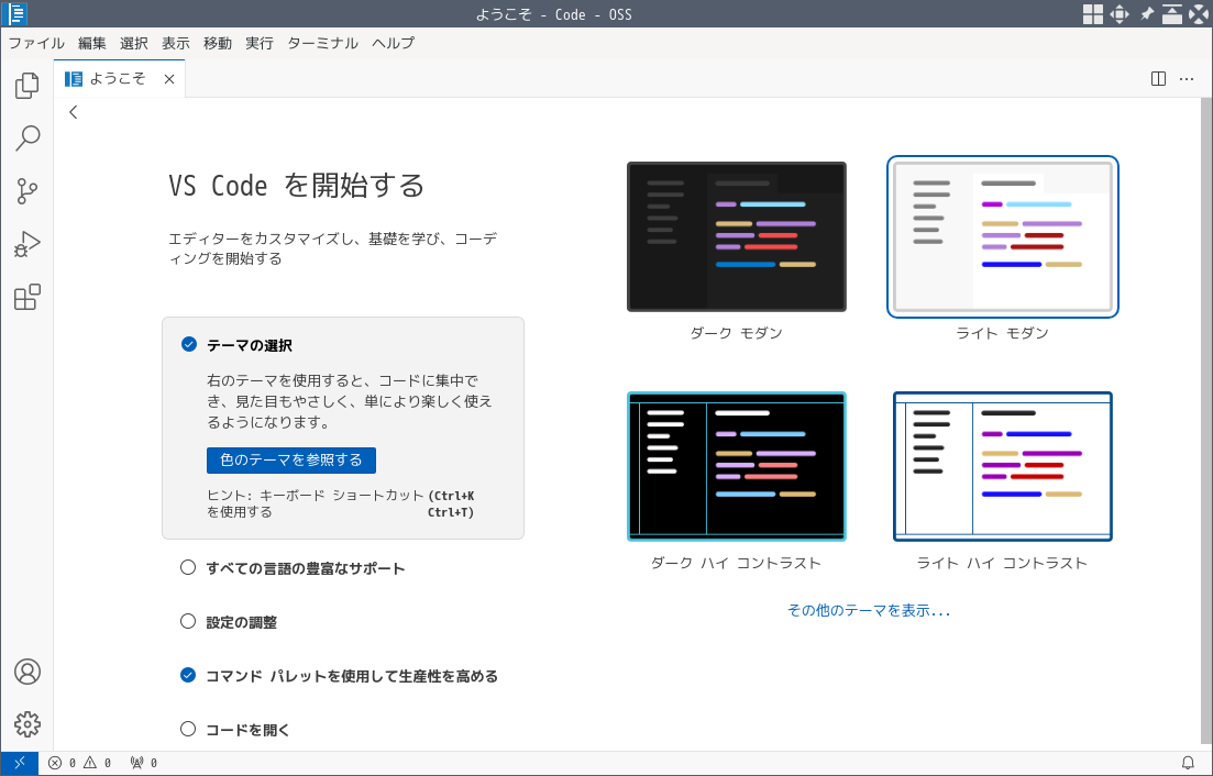 日本語化後、再起動直後の状態です。 2024年10月17日の時点で、下記のバージョンでした。 「Visual Studio Code」の操作等については「統合開発環境 Visual Studio Code」をご参照ください。 |