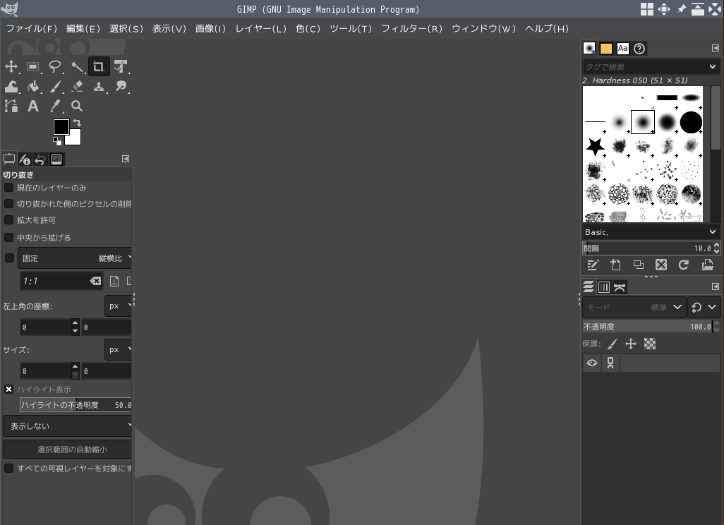 起動直後の状態です。 2024年12月12日の時点で、下記のバージョンでした。 操作については、「画像編集ソフト GIMP2」に掲載しています。 上記は簡単なものですので、詳細なものがほしい方は、各所に初歩の手引きから応用編までありますので、そちらを参考にしてください。 |