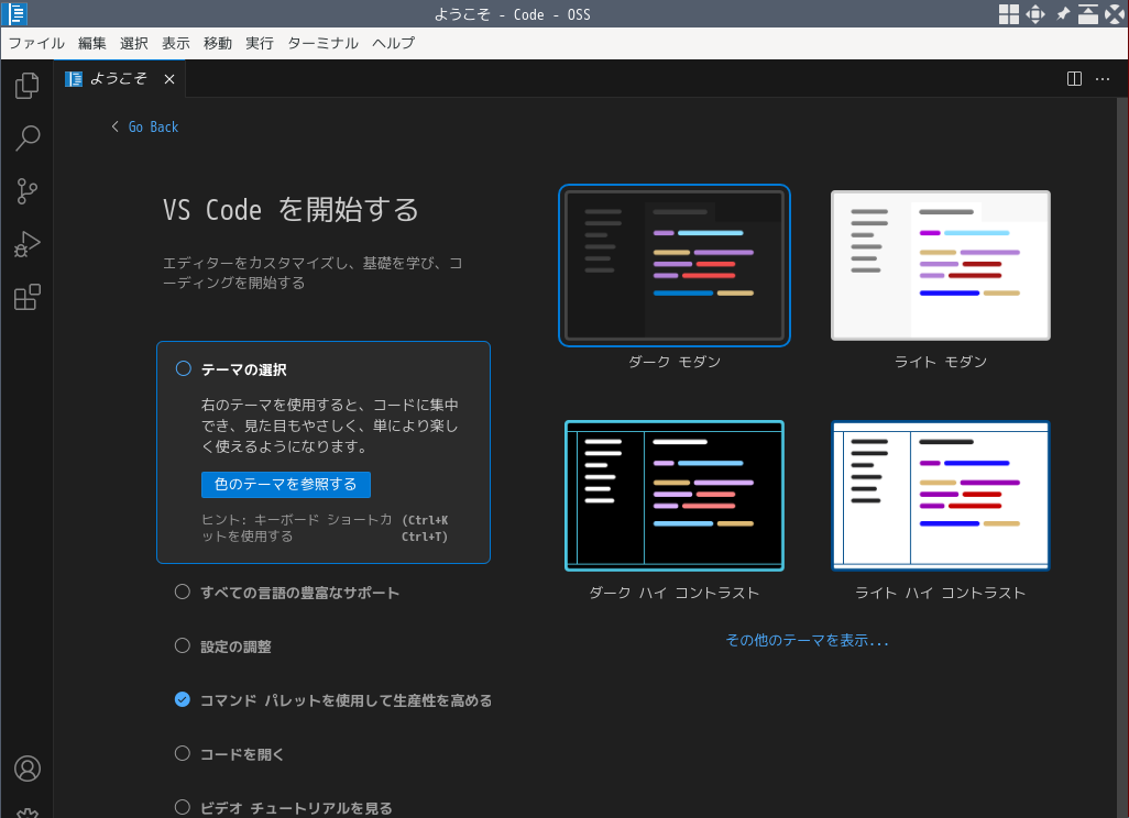 日本語化後、再起動直後の状態です。 2024年12月12日の時点で、下記のバージョンでした。 「Visual Studio Code」の操作等については「統合開発環境 Visual Studio Code」をご参照ください。 |