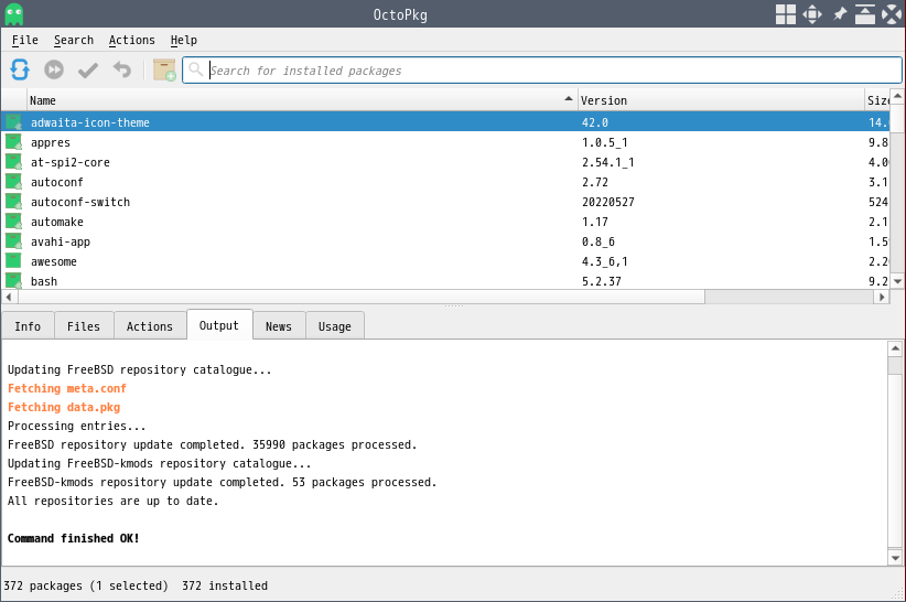 1. 概要 「OctoPkg」は、パッケージ管理(pkg)のグラフィカルフロントエンドです。 基本的な操作については共通事項の「パッケージ管理 OctoPkg」を参照してください。 2. インストール ここまでは、コマンドでインストールしなければならない。 「root」ユーザ権限で。 pkg install -y octopkg 3. 起動 「デスクトップ上右クリック」→「システムツール」→「OctoPkg」