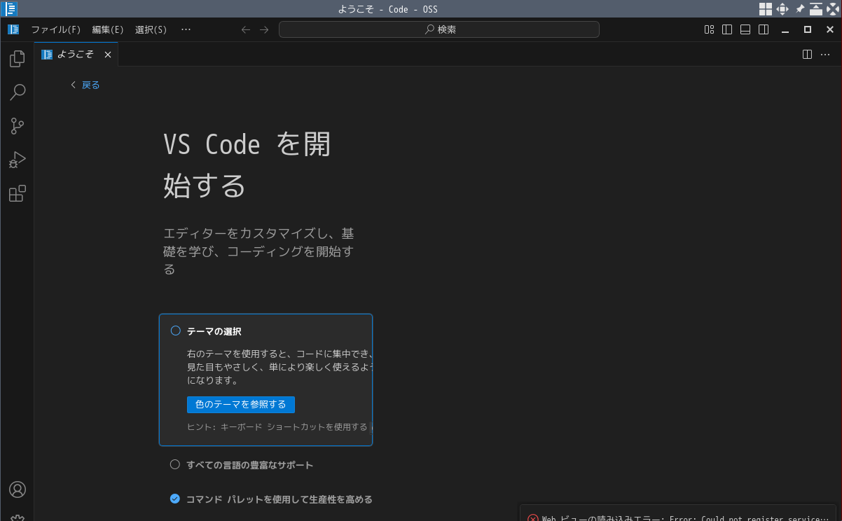 日本語化後、再起動直後の状態です。 2025年6月18日の時点で、下記のバージョンでした。 「Visual Studio Code」の操作等については「統合開発環境 Visual Studio Code」をご参照ください。 |