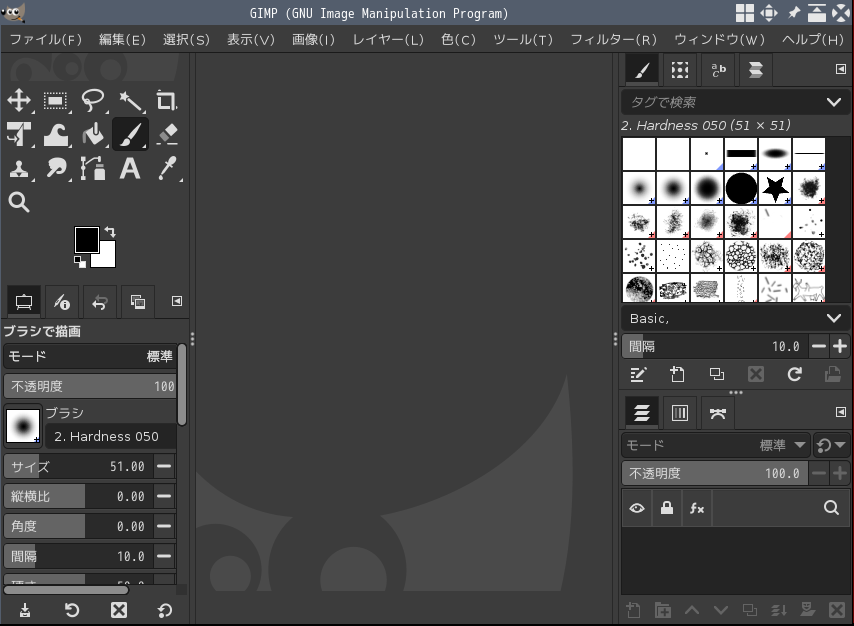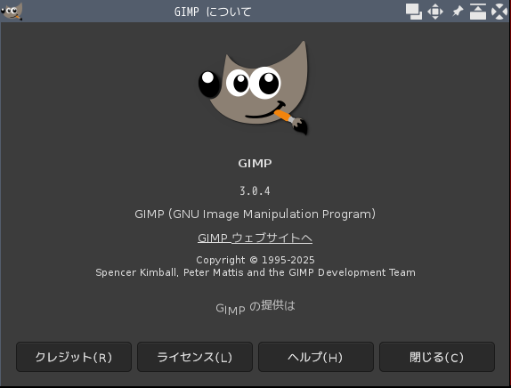 「閉じる」 起動直後の状態です。 2025年12月16日の時点で、下記のバージョンでした。 操作については、「画像編集ソフト - GIMP」に掲載しています。 上記は簡単なものですので、詳細なものがほしい方は、各所に初歩の手引きから応用編までありますので、そちらを参考にしてください。 |