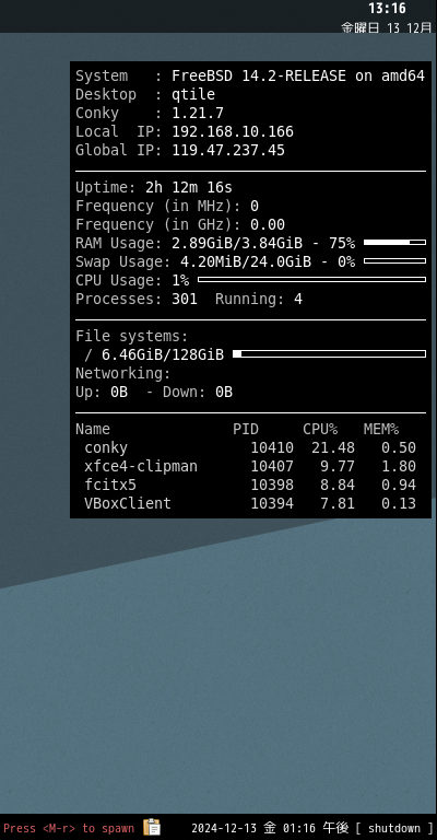 再ログインすると、「Conky」が、デスクトップ上、右上に表示されます。