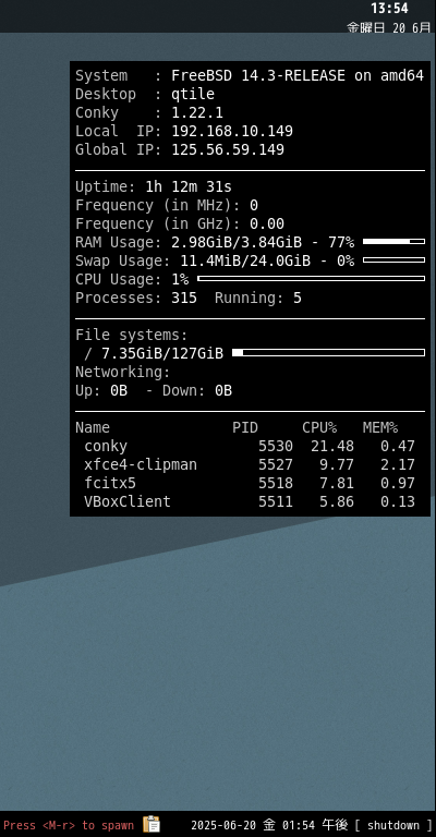 qtile - FreeBSD 14.3 RELEASE - タスクマネージャ Conky