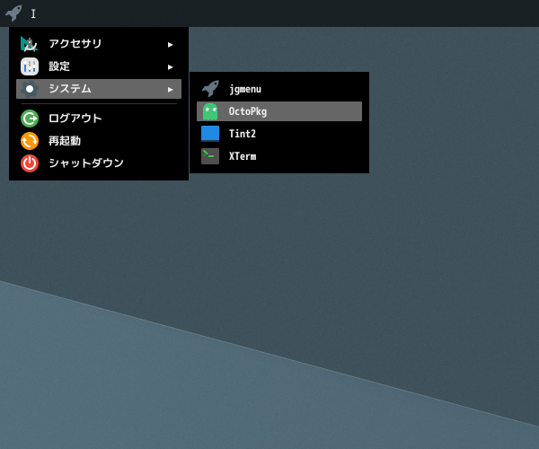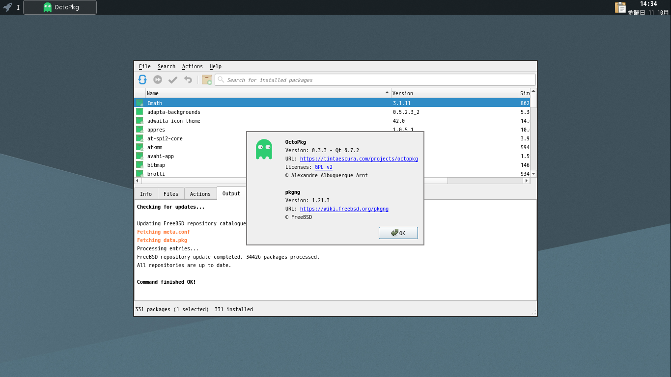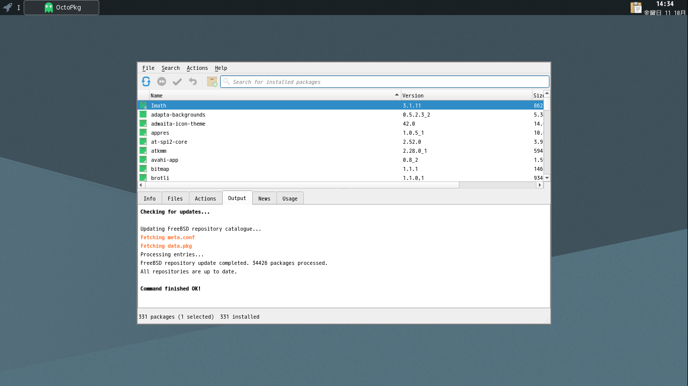 1. 概要 「OctoPkg」は、パッケージ管理「pkg」のグラフィカルフロントエンドです。 基本的な操作については共通事項の「パッケージ管理 OctoPkg」を参照してください。 2. インストール 「root」ユーザ権限で。 pkg install -y octopkg 3. 起動 「スタート」→「システム」→「OctoPkg」