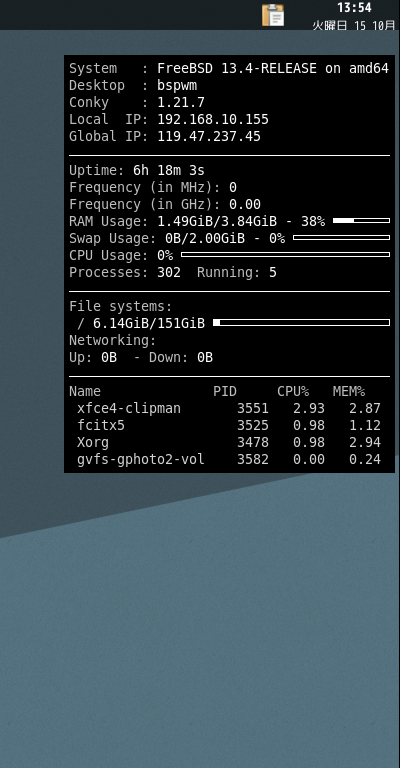 ログインしなおすと「Conky」が起動し、右端に下記のように表示されます。