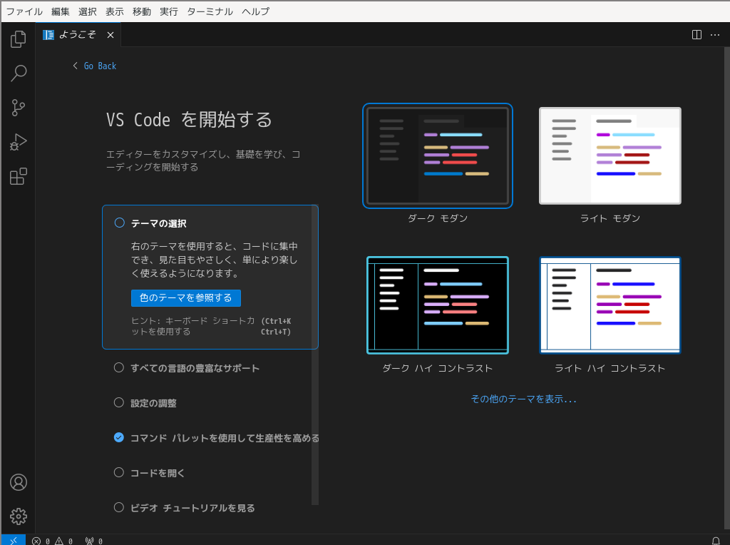日本語化後、再起動直後の状態です。 2024年12月16日の時点で、下記のバージョンでした。 「Visual Studio Code」の操作等については「統合開発環境 Visual Studio Code」をご参照ください。 |
