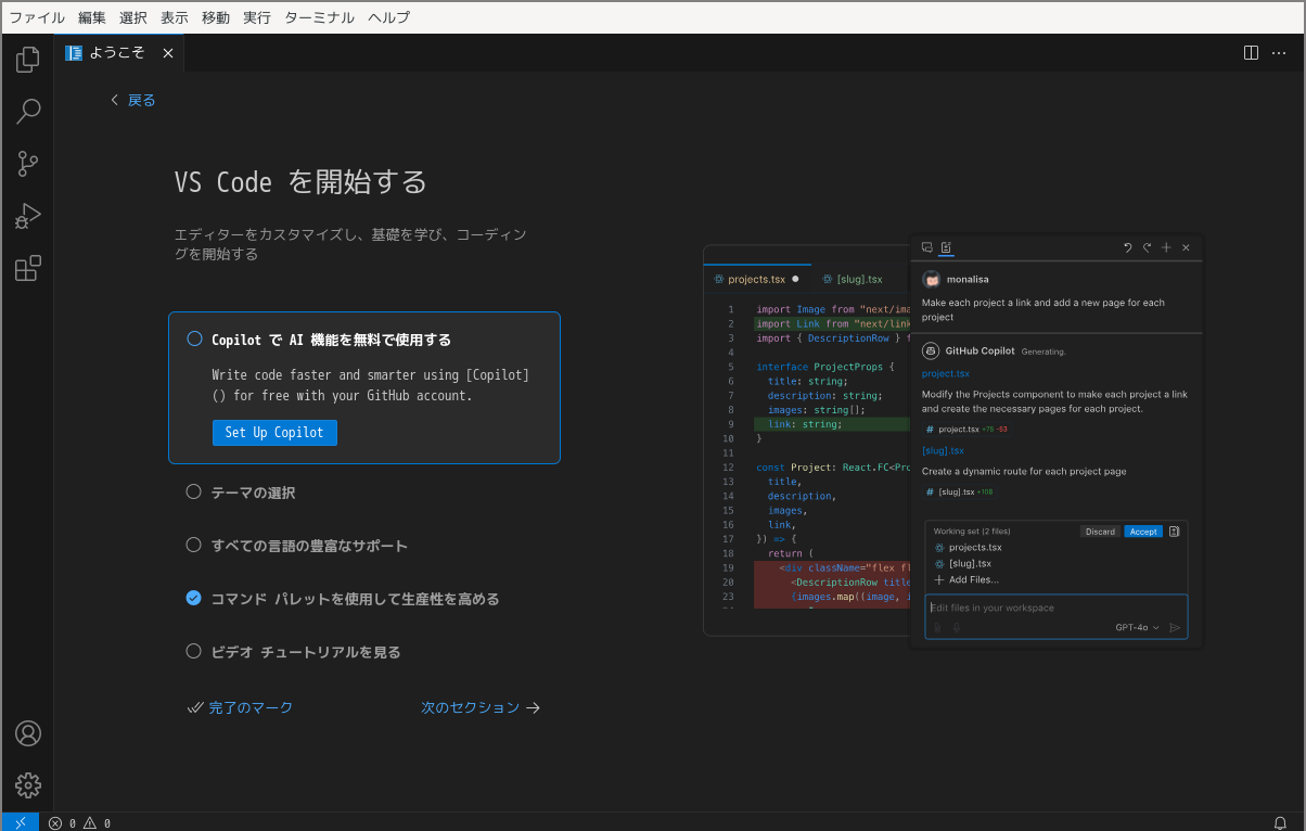 日本語化後、再起動直後の状態です。 2024年12月16日の時点で、下記のバージョンでした。 「Visual Studio Code」の操作等については「統合開発環境 Visual Studio Code」をご参照ください。 |
