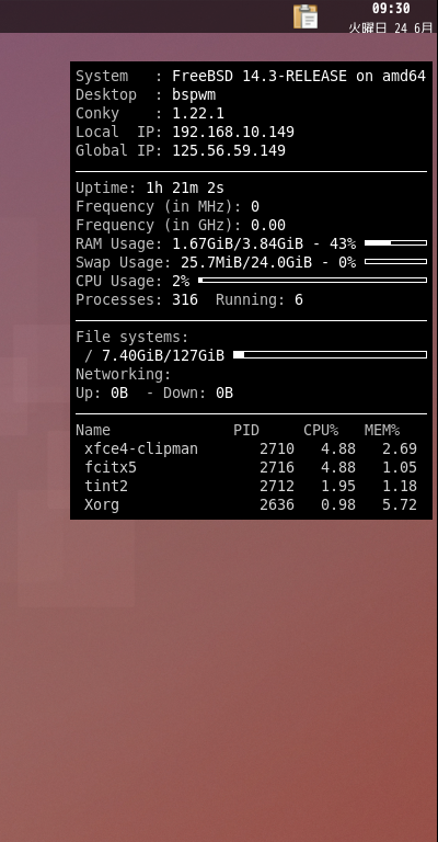 ログインしなおすと「Conky」が起動し、右端に下記のように表示されます。