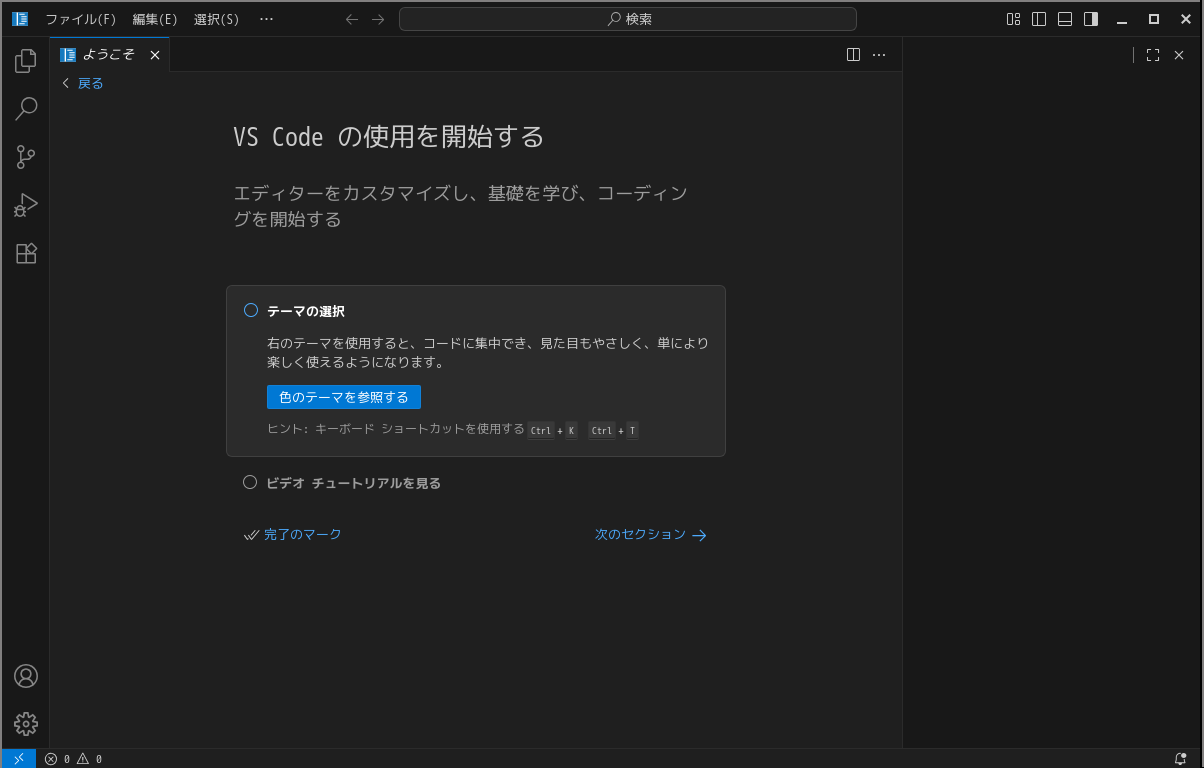 日本語化後、再起動直後の状態です。 2025年12月18日の時点で、下記のバージョンでした。 「Visual Studio Code」の操作等については「統合開発環境 Visual Studio Code」をご参照ください。 |