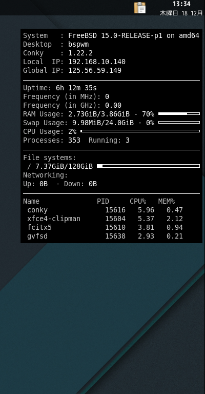 ログインしなおすと「Conky」が起動し、右端に下記のように表示されます。