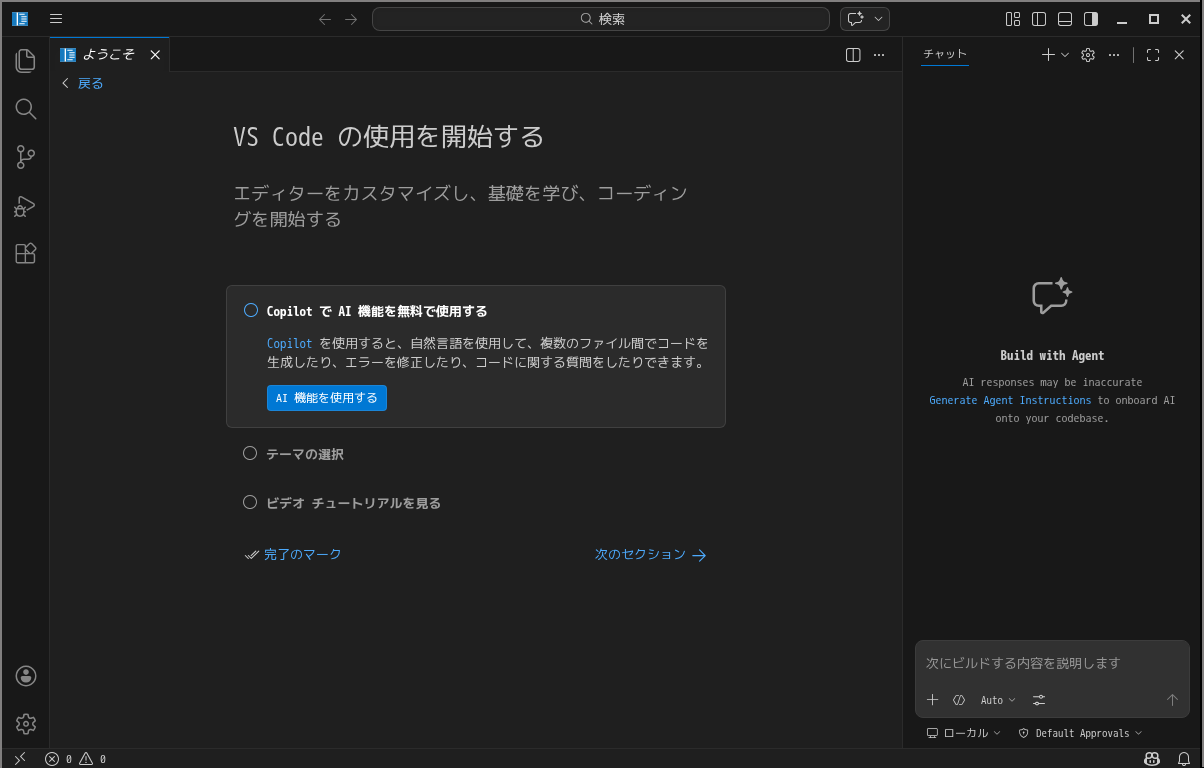 日本語化後、再起動直後の状態です。 2026年4月3日の時点で、下記のバージョンでした。 「Visual Studio Code」の操作等については「統合開発環境 Visual Studio Code」をご参照ください。 |