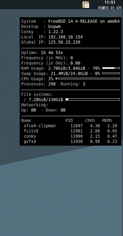 ログインしなおすと「Conky」が起動し、右端に下記のように表示されます。