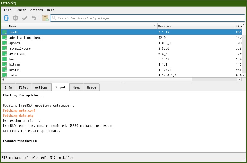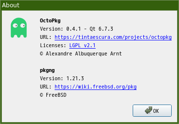 1. 概要 「OctoPkg」は、「pkg」コマンドのフロントエンドです。 2. インストール 「OctoPkg」自体は、コマンドでインストールします。 「root」ユーザ権限で。 pkg install -y octopkg 3. 起動 「スタート」→「システム」→「OctoPkg」