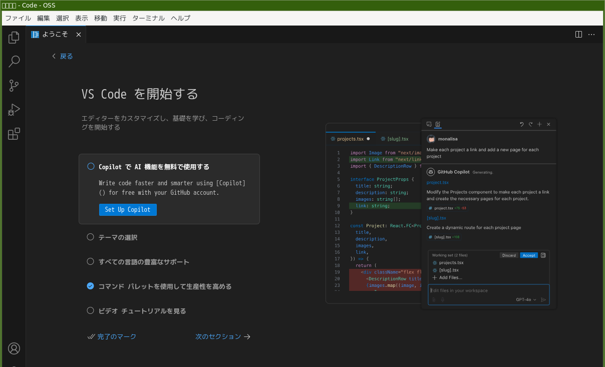 1. 概要 開発環境として、「Visual Studio Code」を使用します。 2. インストール 「OctoPkg」で、「vscode」を検索して、インストールします。 3. 起動 「スタート」→「開発」→「Code - OSS」