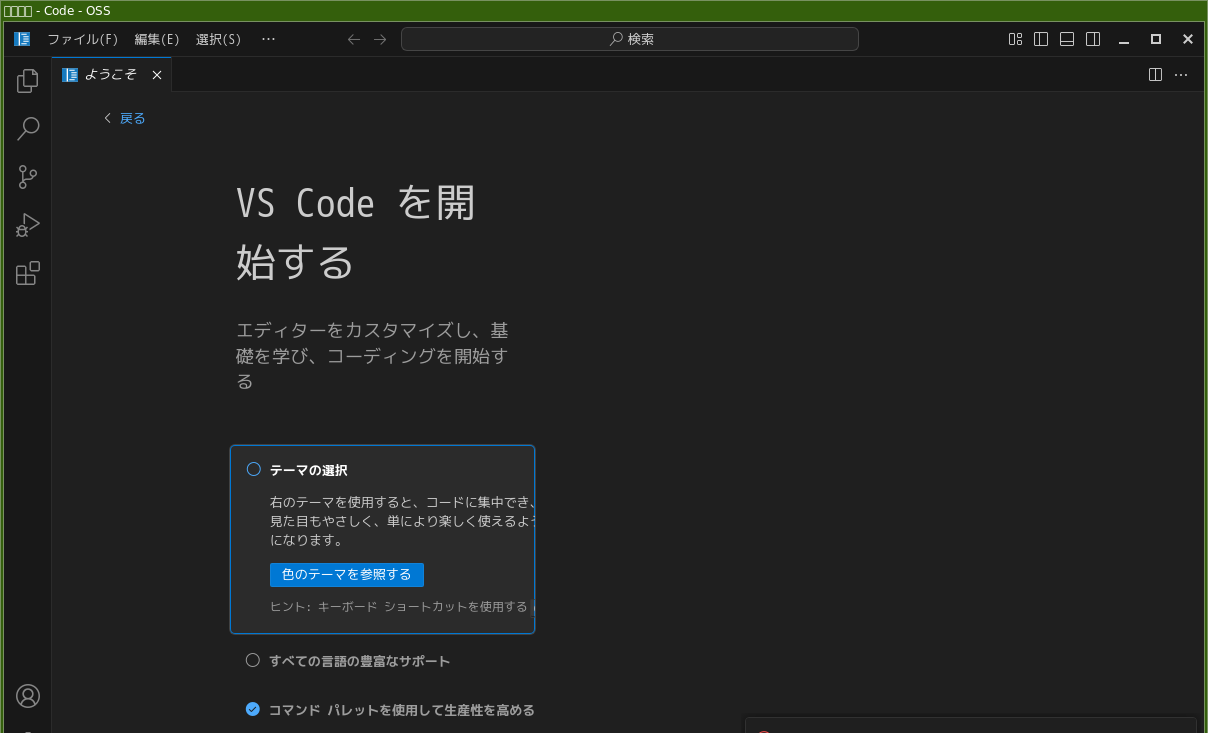 1. 概要 開発環境として、「Visual Studio Code」を使用します。 2. インストール 「OctoPkg」で、「vscode」を検索して、インストールします。 3. 起動 「スタート」→「開発」→「Code - OSS」