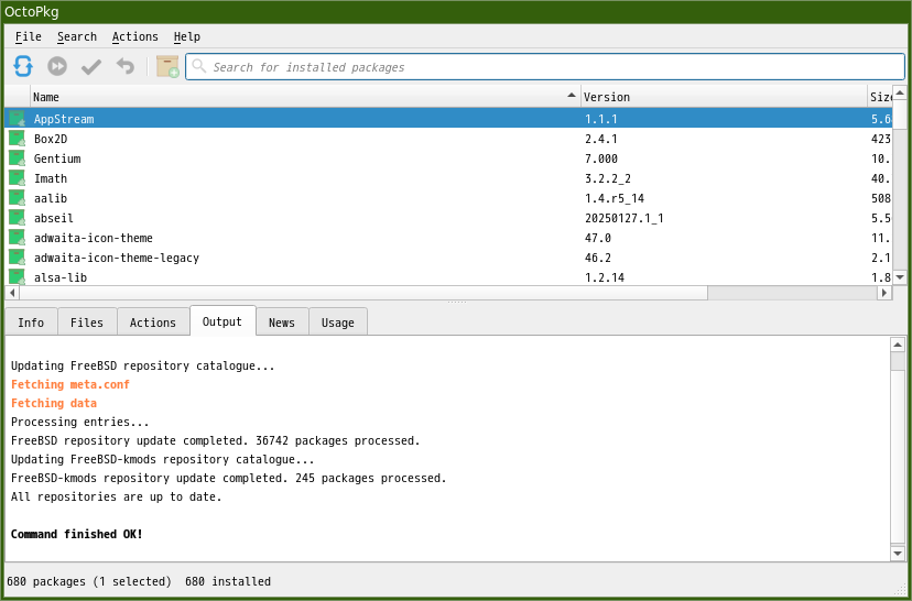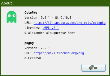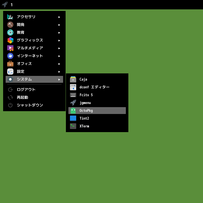 1. 概要 「OctoPkg」は、「pkg」コマンドのフロントエンドです。 2. インストール 「OctoPkg」自体は、コマンドでインストールします。 「root」ユーザ権限で。 pkg install -y octopkg 3. 起動 「スタート」→「システム」→「OctoPkg」