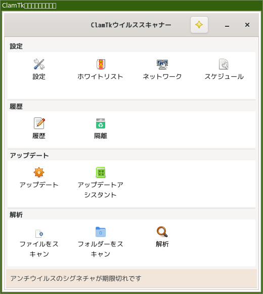 操作方法等に関しては、「デスクトップ環境構築 - 共通事項 - アンチウイルスソフト ClamTk」をご参照ください。