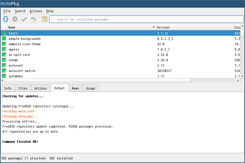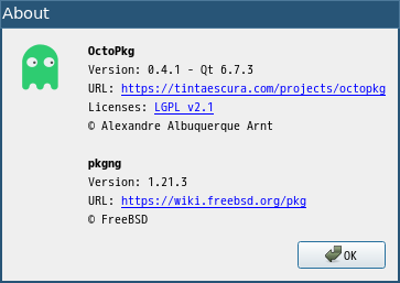 1. 概要 「OctoPkg」は、パッケージ管理(pkg)のグラフィカルフロントエンドです。 基本的な操作については共通事項の「パッケージ管理 OctoPkg」を参照してください。 2. インストール 「root」ユーザ権限で。 pkg install -y octopkg 3. 起動 「スタート」→「システム」→「OctoPkg」